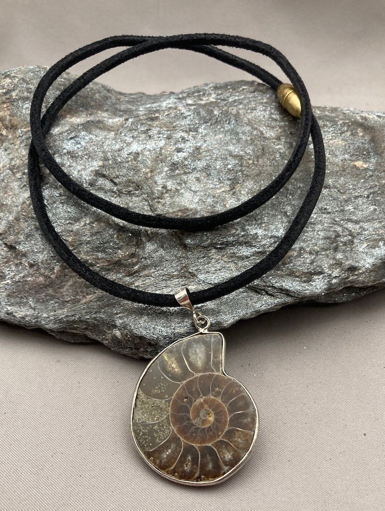 Ammonite Suspended on Black Suede Cord, Resin Magnetic Clasp. 19.5"