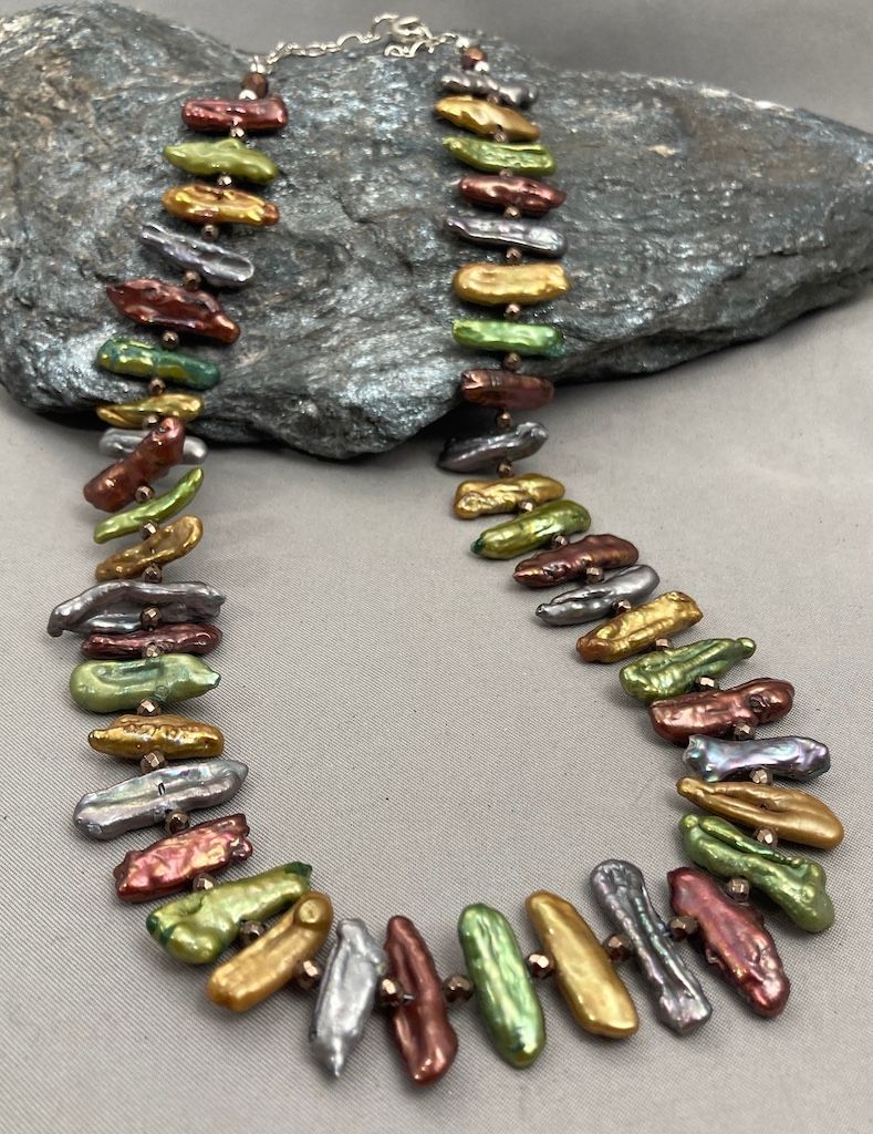 Bijou Pearls in rich tones of Bronze, Basil Green, Burgundy & Pewter, accented w Pyrite. Sterling Silver Clasp and Chain. Adjustable sizing 18 1/4" - 19 3/4"