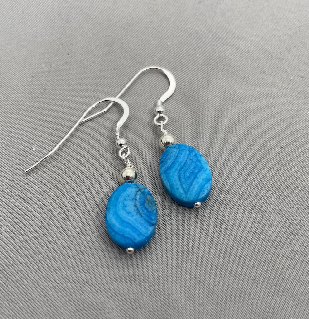 Blue Crazy lace Agate accented with Sterling Silver Bead. Sterling Silver Ear Wires