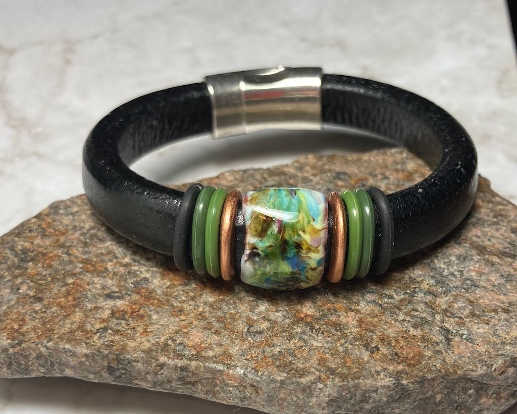 Italian Leather w Handmade Copper Enamel Slider, copper and colorful rubber ring accents - 7 1/4" (if you own any of these leather bracelets the end to end measurement of this piece is 7 3/4"" and wears as a 7 1/4"" bracelet.