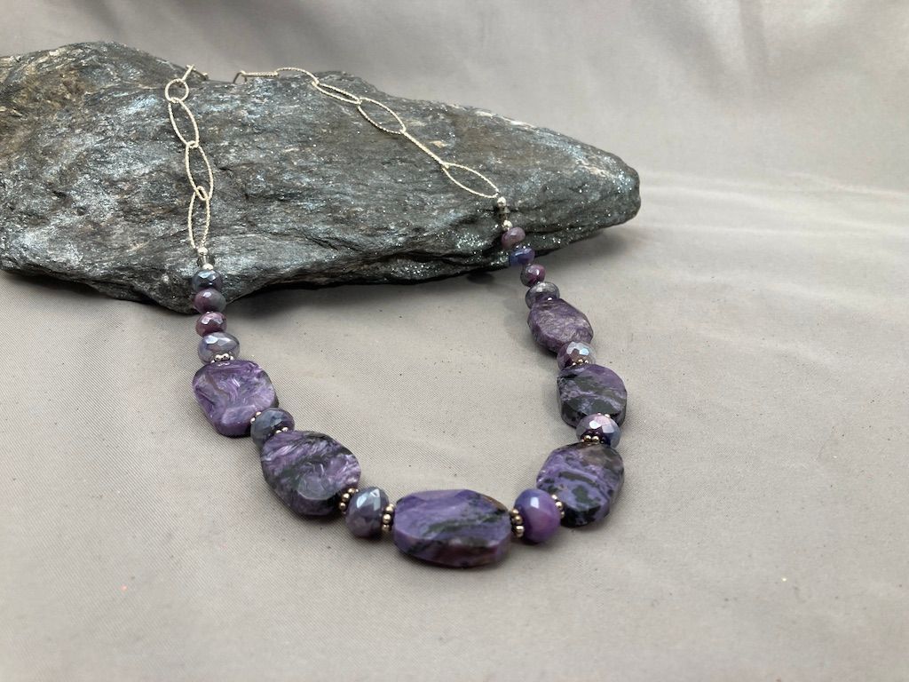 Charoite & Moonstone w Dimond Cut Sterling Silver Chain. SS Clasp - 19.25" adjustable smaller