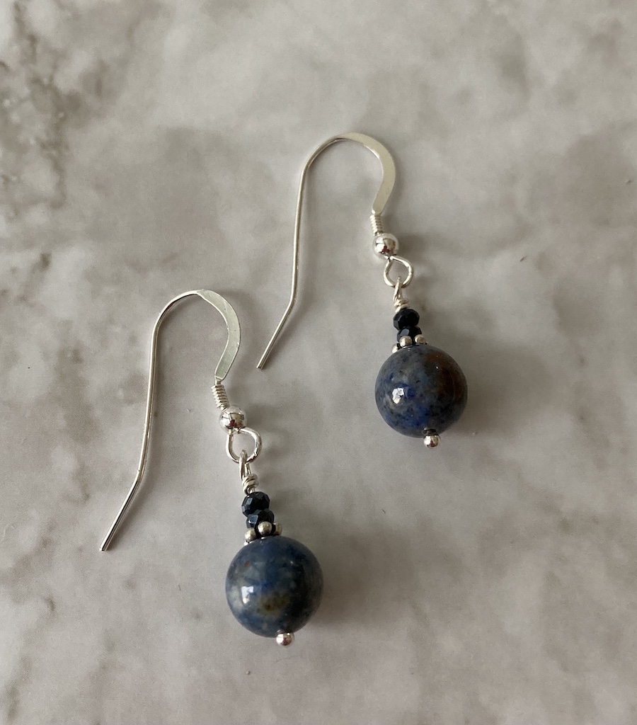Natural Dumortierite, known as the "Blue Jean Stone", is accented with Pyrite for a touch of sparkle & Sterling Silver. Sterling Silver Ear Wires.