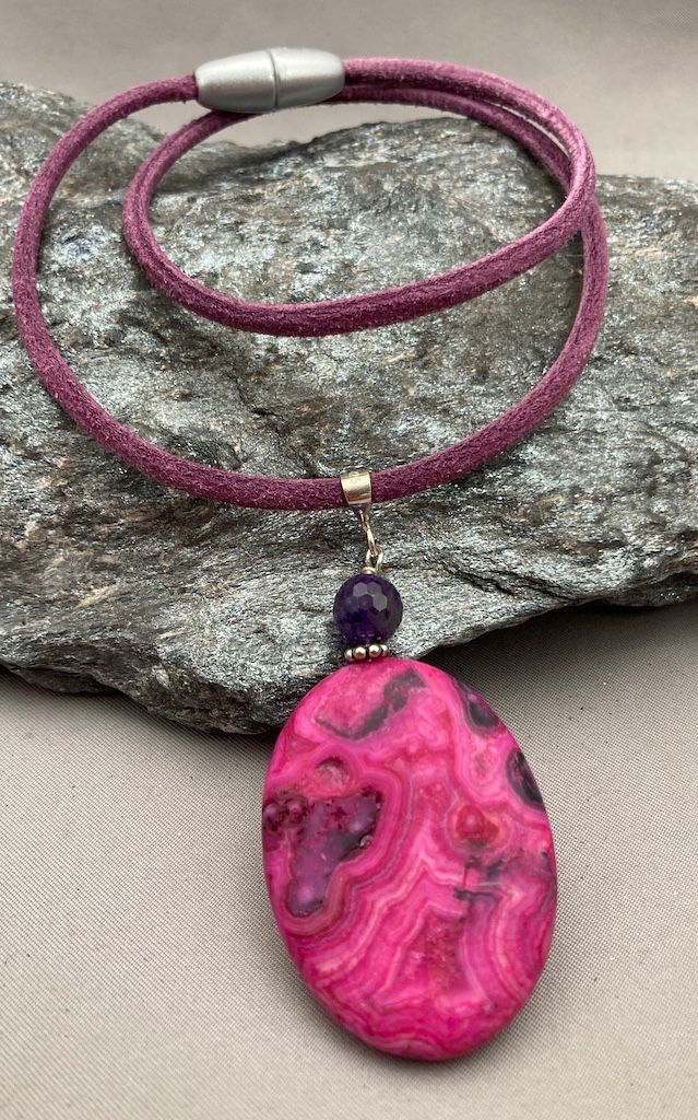 Fuchsia Crazy Lace Agate w Amethyst & Sterling Silver Bail