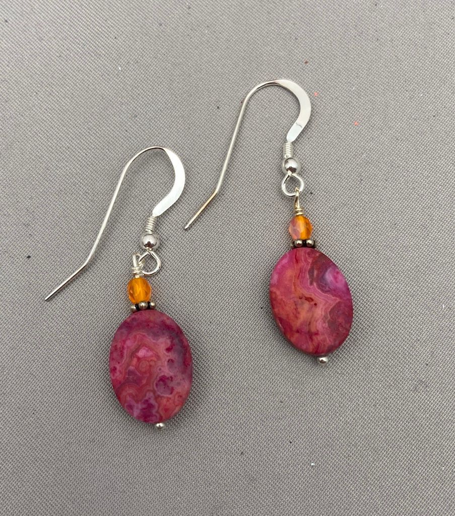 Fuchsia Crazy Lace Agate w Orange Czech Crystal, Sterling Silver Ear Wires