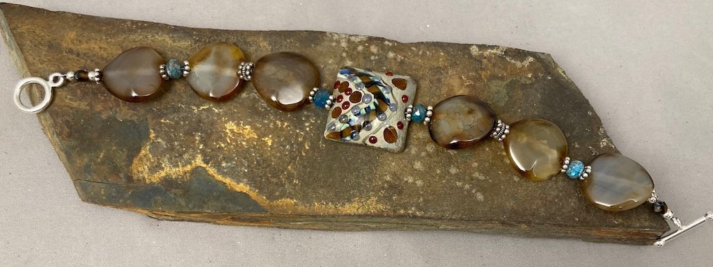 Handmade Lampwork Glass Focal Bead, Madagascar Agate, Sterling Silver & Blue Apatite. Sterling Silver Toggle Clasp. 8 1/2"