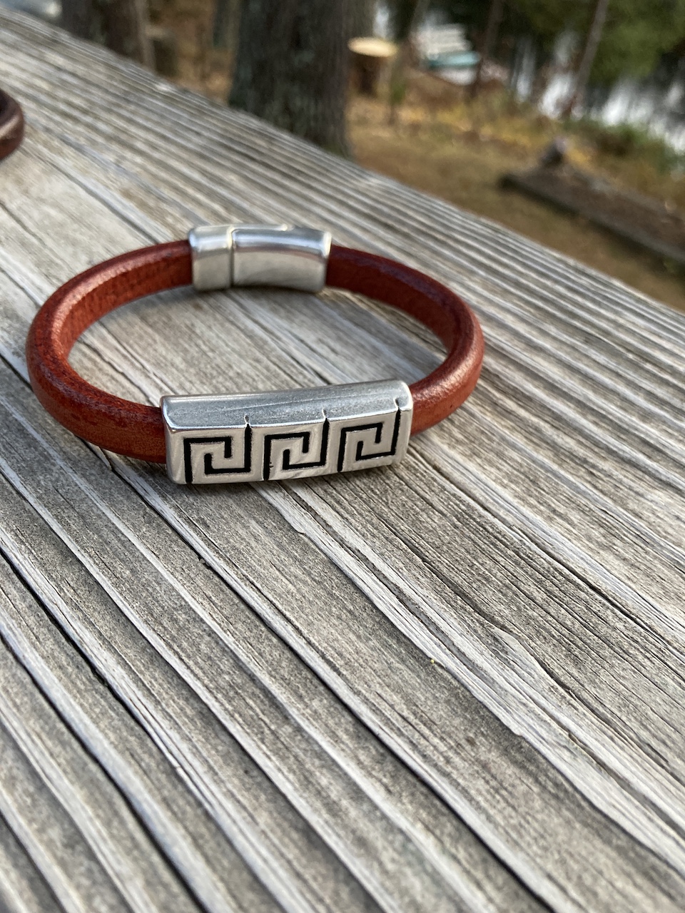 Italian Leather with Pewter Meander & Magnetic Clasp - Nickel & Lead Free. Choice of leather colors: Black, Dark Brown, Navy, Whiskey