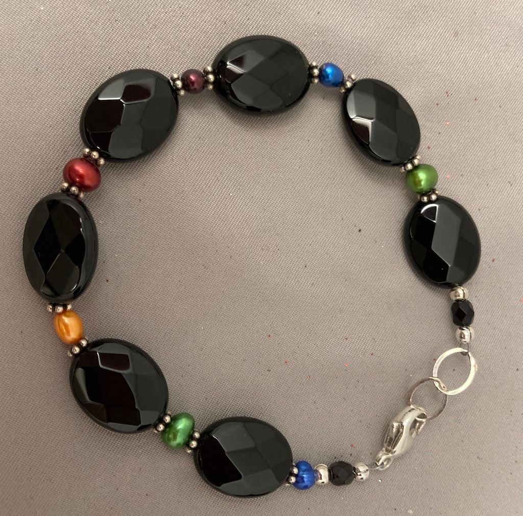 Facet Cut Onyx with Jewel Tone Freshwater Pearls, Sterling Silver Accents, Clasp & Chain.