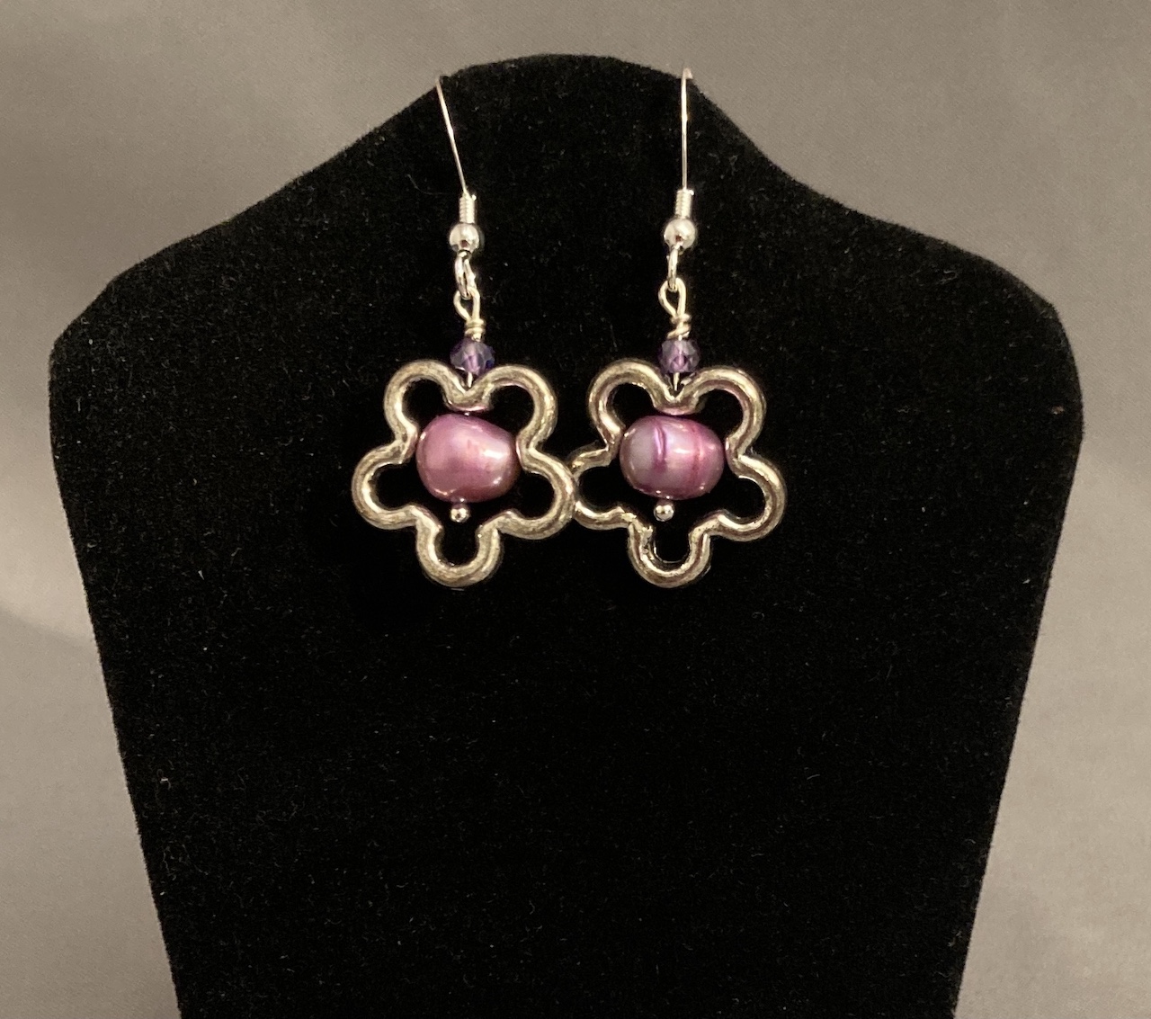 Pewter Flower w Lilac Freshwater Pearl, Sterling Silver, Swarovski Crystal. Sterling Silver Ear Wires