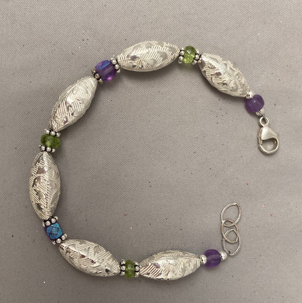 Textured Pewter interspersed with Amethyst, Peridot, Sterling Silver Accents and Clasps. Adjustable 7 1/2" - 8 1/4"