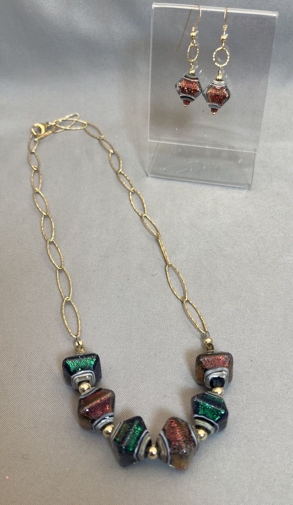 Handmade Lampwork Glass in Glittering Red & Green, paired with a Diamond Cut Gold Filled Chain & Clasp. Necklace Length 18.25" adjustable to shorter length. Priced individually - Necklace $125, Earrings $38 - at $99 this set is a wonderful gift for someone on your list or for YOU!