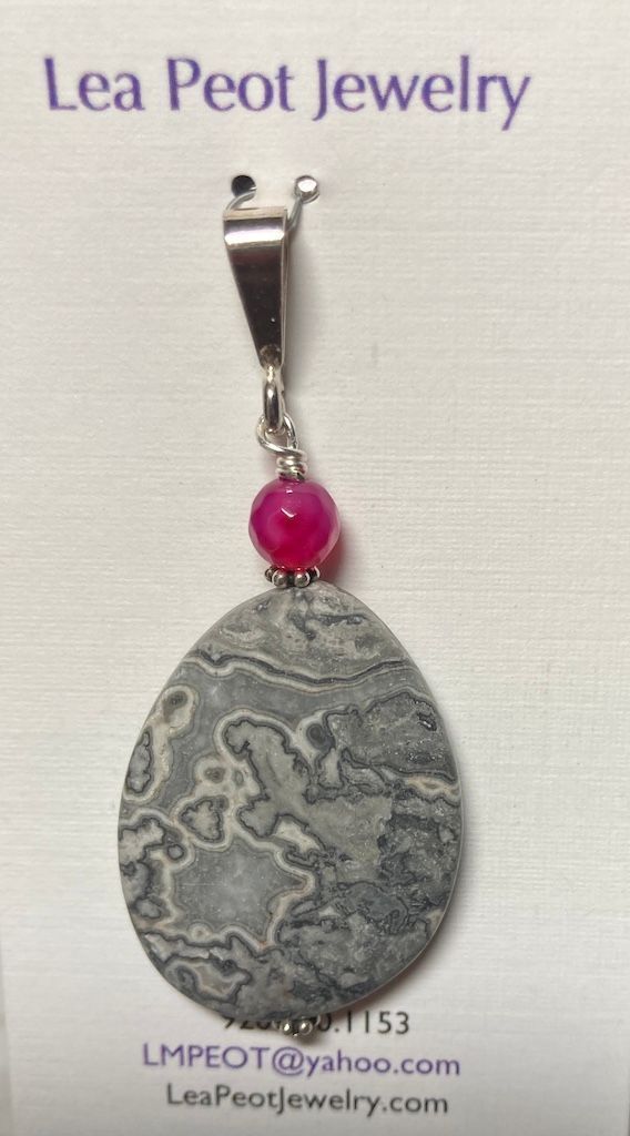 Silver Crazy Lace Agate w Fuchsia Quartz, Sterling Silver Bail