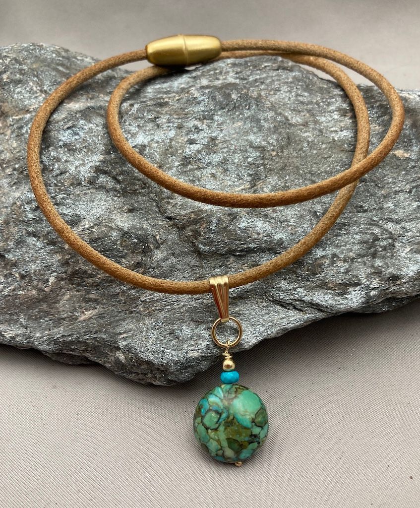 Turquoise & Jasper Composite Bead accented w Facet Cut Turquoise, Gold Filled Bead & Bail. Suede Cord, Resin Magnetic Clasp. 19 1/4"